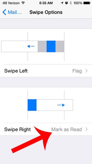 Mutta jos et ole tyytyväinen siihen, mitä vasen tai oikea pyyhkäisy voi tehdä sähköpostille, voit muuttaa sen tekemään jotain muuta. Alla oleva oppaamme näyttää, kuinka valita, mikä vasen pyyhkäisy ja oikea pyyhkäisy tekee tietylle sähköpostille iPhonessa.