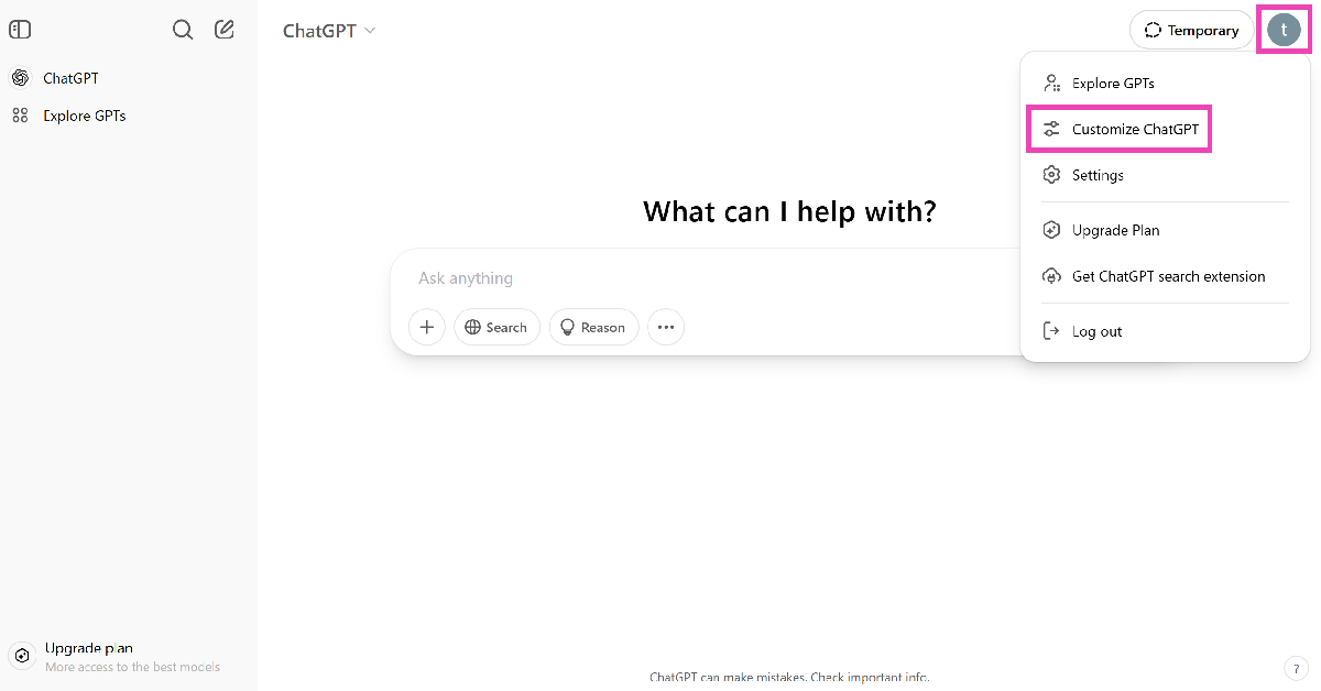 Vaihe 2:Napsauta omaasiprofiilikuvanäytön oikeassa yläkulmassa ja valitseMukauta ChatGPT.