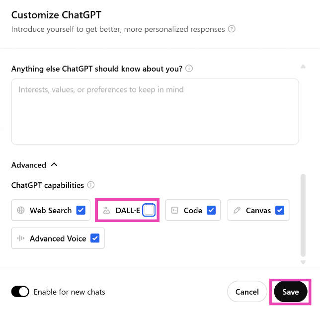 Vaihe 4: Poista valintaruutuun Dall-E:n vieressä ja painaTallentaa.