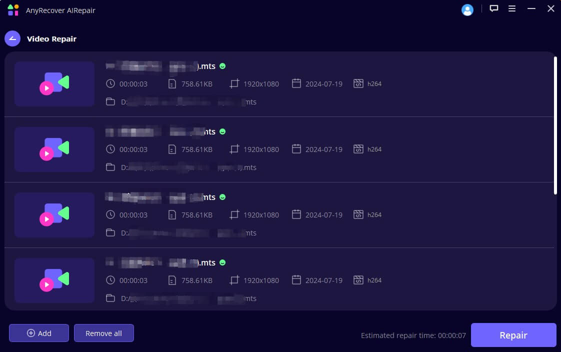 AnyRecover AIRepairin käyttäminen on myös erittäin yksinkertaista muutamalla napsautuksella. Lataa vain videot, jotka haluat korjata, napsauta painiketta aloittaaksesi korjaamisen, ja sitten se korjaa videon automaattisesti puolestasi. Jos sinulla on useita korjattavia videoita, myös setukee eräkorjausta, joka voi korjata useita videoita samanaikaisesti ja säästää paljon aikaa. Tässä ovat tämän tuotteen tärkeimmät ominaisuudet: