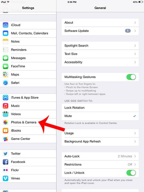 Vaihe 2: Vieritä alas ja valitseValokuvat ja kameraVaihtoehto näytön vasemmalla puolella olevassa sarakkeessa.