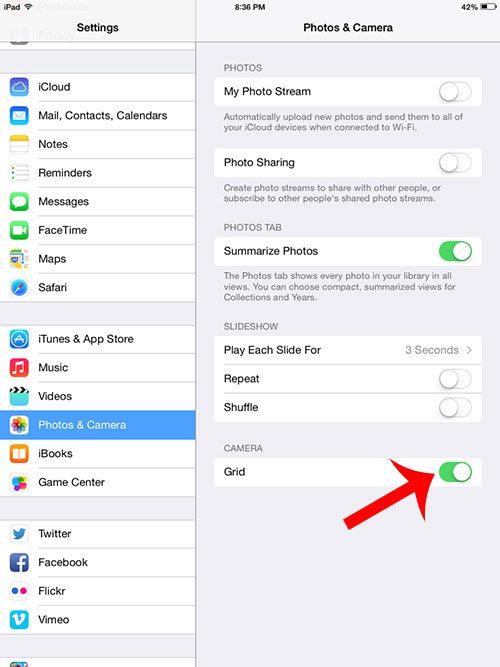 Tätä ruudukkoa on hyödyllinen antamalla sinun käyttää kolmansien sääntöä, joka on valokuvaustekniikka, jonka tarkoituksena on parantaa kuvien koostumusta. Joten jos olet kiinnostunut oppimaan ottamaan parempia kuvia iPadin kamerasi kanssa, seuraa alla olevia vaiheita oppiaksesi käynnistämään iPadin kameran ruudukko.