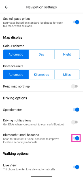 Siirry osoitteeseenProfiili> Asetukset> Navigointiasetuksetja kytke päälle Bluetooth-tunnelimajakoiden vaihtokytkin.