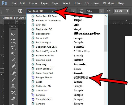 - Sulje Photoshop, jos se oli jo auki, käynnistä Photoshop ja etsi fontti Tekstityyppi-työkalusta.
