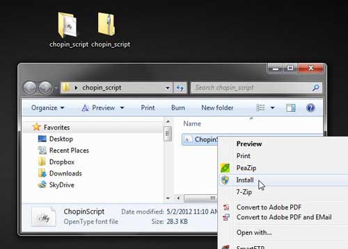 Kun olet hankkinut fontin, jonka haluat lisätä Photoshop CS5:een, sinun on löydettävä se tietokoneeltasi. Tätä opetusohjelmaa varten käytän fonttitiedostoa nimeltä Chopin Script, jonka löysin osoitteestaDafont.com. Useimmat kirjasimet jaetaan zip-kansion sisällä, joten sinun on purettava tiedostot zip-kansiosta ennen kuin voit lisätä fontin Adobe Photoshop CS5:een.
