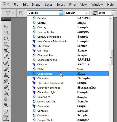 Voit vahvistaa, että olet lisännyt fontin Photoshop CS5:een käynnistämällä ohjelman ja napsauttamallaTeksti-työkalu ikkunan vasemmalla puolella olevassa työkalupalkissa ja napsauta sittenFonttiavattavasta valikosta löytääksesi juuri asennetun fontin.