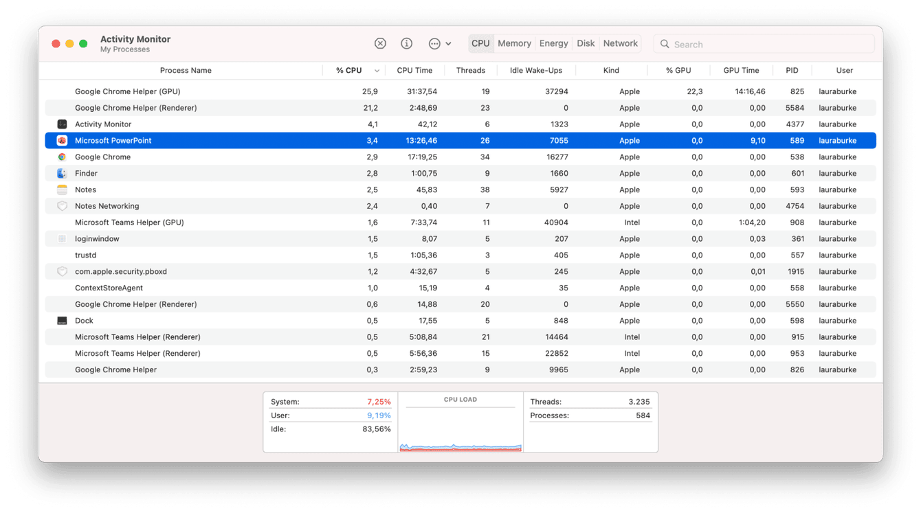 Valitse CPU -välilehti ja katso kohteita. Jos näet jotain käynnissä, jota et tarvitse, valitse se, napsauta sitten X -painiketta heti.