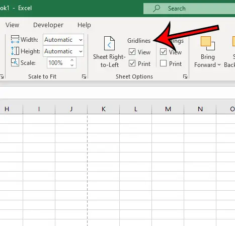 Vaihe 3: PaikannaRuudukkolinjat-osiossaArkin asetuksetnauhan ryhmää ja napsauta sitten valintaruutua kunkin vaihtoehdon vasemmalla puolella, jotka haluat ottaa käyttöön.