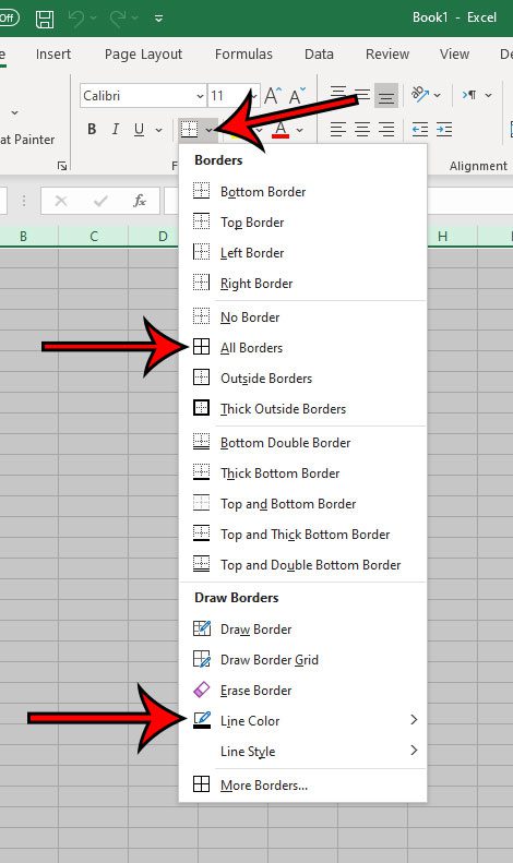 - Sinulla on toinen vaihtoehto, joka voi tarjota jotain samanlaista kuin ruudukkolinjat, nimeltään Borders. Valitse ensin kaikki solut, joille haluat käyttää reunaa. Napsauta sittenKotiin-välilehti ikkunan yläosassa ja etsiFonttinauhan osa. Seuraavaksi voit napsauttaa nuolta oikealla puolellaRajat-painiketta ja valitseKaikki rajatvaihtoehto. Voit sitten avata valikon uudelleen ja valitaViivan väri-vaihtoehto asettaaksesi haluamasi värin reunuksille, jolloin saat erilaisen reunuksen värin tai ruudukon värin.