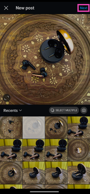 Vaihe 2:PysyäPostitusvälilehtija valitse kuva puhelimen galleriasta tai ota kuva etsimellä. OsumaSeuraava.