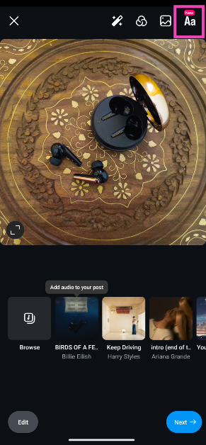Kun olet valinnut kuvan postittavan kuvan Instagramiin, napsauta näytön oikeassa yläkulmassa olevaa 'AA' -kuvaketta lisätäksesi tekstiä siihen.