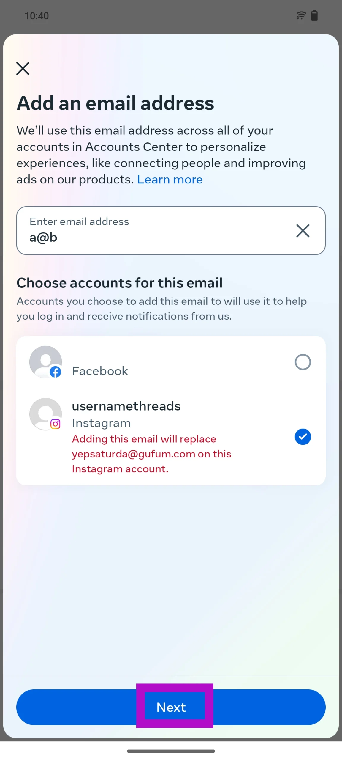 Vaihe 8:Kirjoittaasähköpostiosoiteja valitse Instagram -tilisi luettelosta.