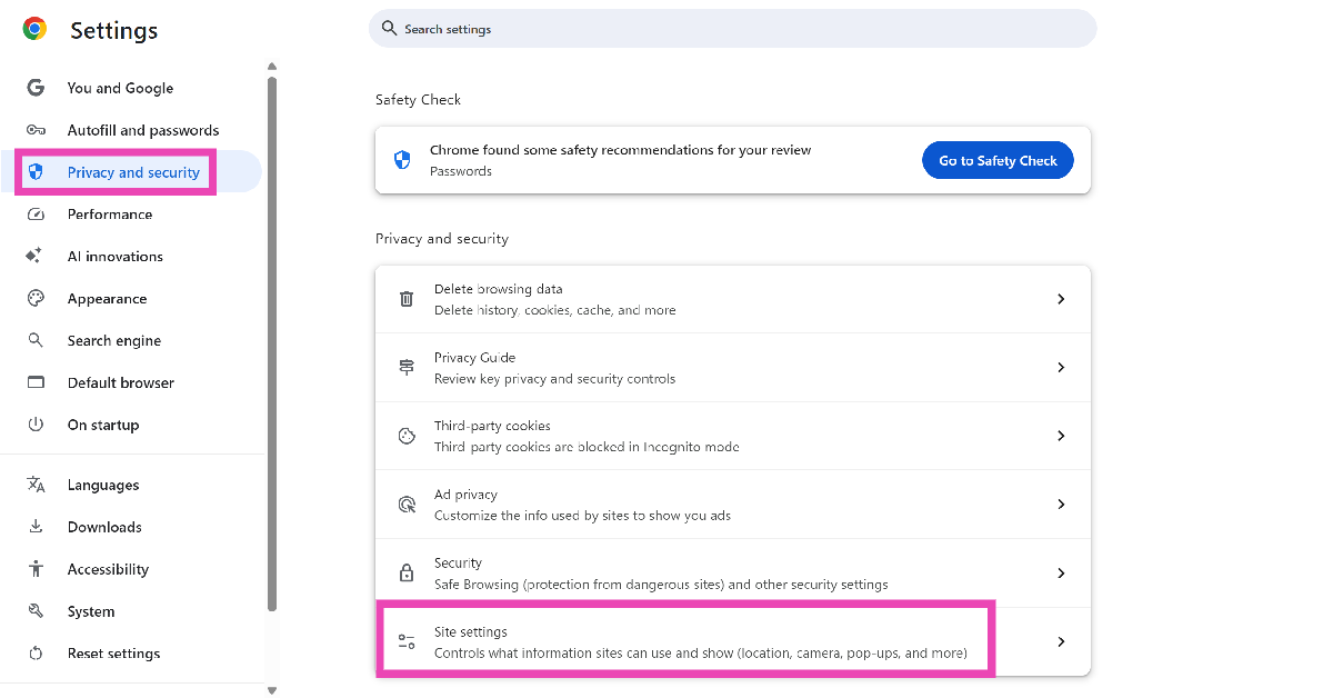 Vaihe 3:ValitaYksityisyys ja turvallisuussivupalkista ja meneSivuston asetukset.