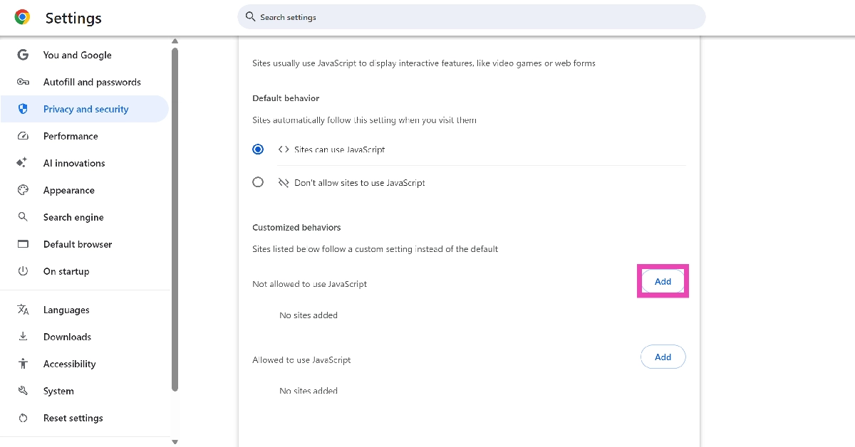 Kopioi YouTube -URL, siirry osoitteeseenChrome Asetukset> Tietosuoja ja suojaus> Sivustoasetukset> JavaScript, Napsauta Add -painiketta, jonka vieressä ei ole JavaScriptin käyttöä, liitä URL -osoite ja napsauta 'Lisää'.