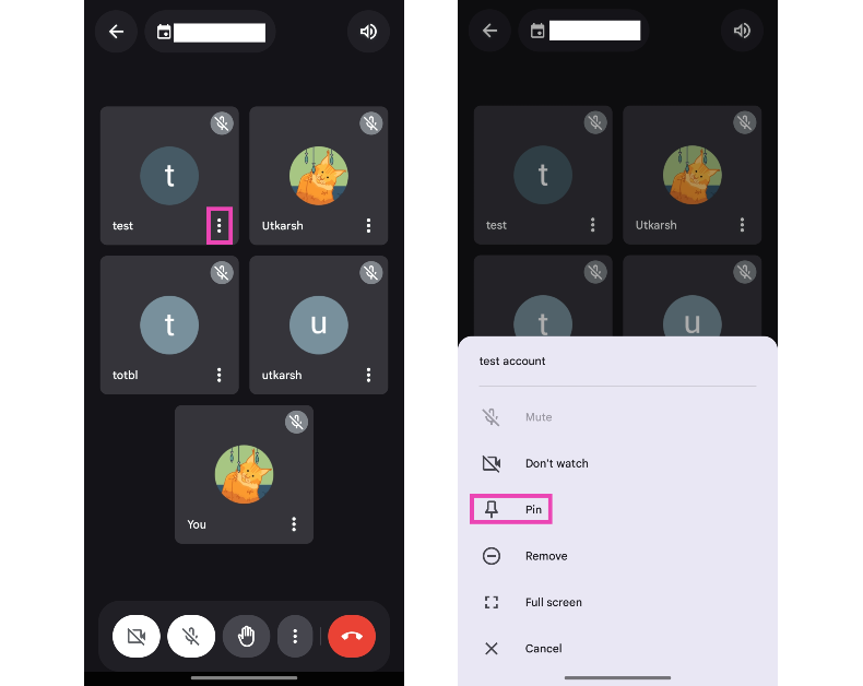 - Osallistujan kiinnittäminennäytön yläosaan,lyödä ellipsejä heidän laattaanja valitse 'PIN'. Tämä laajentaa heidän solua ja kiinnittää sen näytön yläosaan.