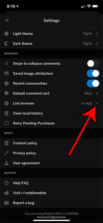 Tämän artikkelin vaiheet näyttävät sinulle, kuinka Reddit iPhone -sovelluksen käyttämä selain voidaan muuttaa, kun napsautat linkkiä viestissä.