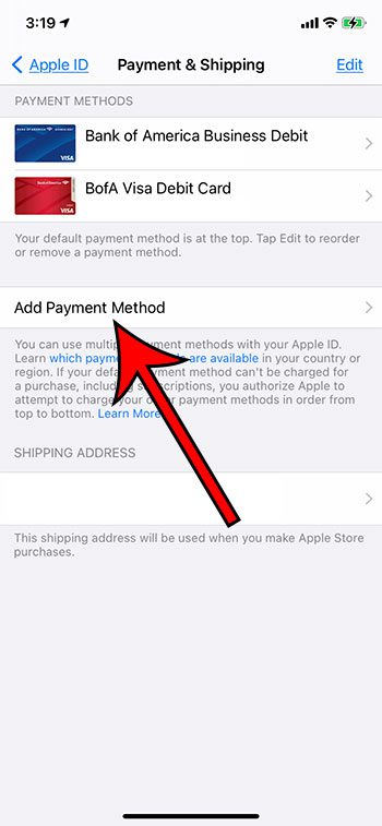 Kun palaat näytölle maksutapoilla, uusi kortti on lueteltava yläreunassa, mikä tarkoittaa, että se on nyt oletus. Voit muuttaa Applen ID -maksutapaamenetelmän napauttamalla Muokkaa -painiketta ja vetämällä sitten haluttu oletuskortti luettelon yläosaan.