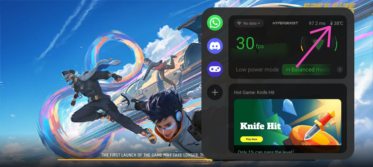 Suurimmassa osassa Android -älypuhelimia on mukautettuja pelityökaluja, joiden avulla käyttäjät voivat tarkastella FPS: tä, muuttaa ääntään, ottaa käyttöön DND: n ja tehdä paljon enemmän pelaamisen aikana. Voit tarkastella puhelimen sisälämpötilaa nopeasti pelityökalujen paneelilla. Pyyhkäise vain yläkulmista tai pyyhkäise näyttöä kohti puhelimen reunaa paljastamaan pelityökalut. Lämpötila luetellaan ylimmässä osassa.