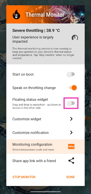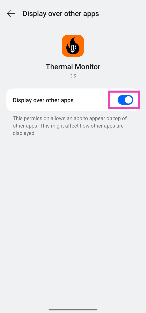 Asenna Thermal Monitor -sovellus, kytke kytkin kytkin päälle 'kelluvan tila -widgetin' viereen ja anna sovelluksen näyttää muiden sovellusten yli. Kun se on valmis, sovellus peittää puhelimen sisälämpötilan näytössä.