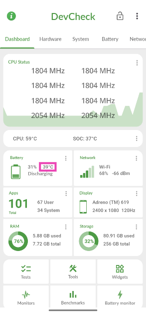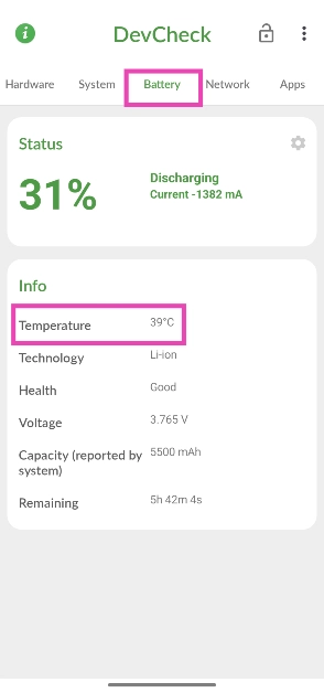 Käytä sovelluksia, kuten Devcheck -laite- ja järjestelmätiedot, Castro ja Accubattery, tarkistaaksesi älypuhelimen sisälämpötilan.