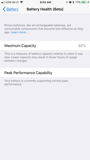 Onneksi iOS 11.3 -päivitys sisältää uuden akun terveysominaisuuden, joka antaa sinun tietää, kuinka paljon prosentuaalista kapasiteettia laitteesi käyttää.