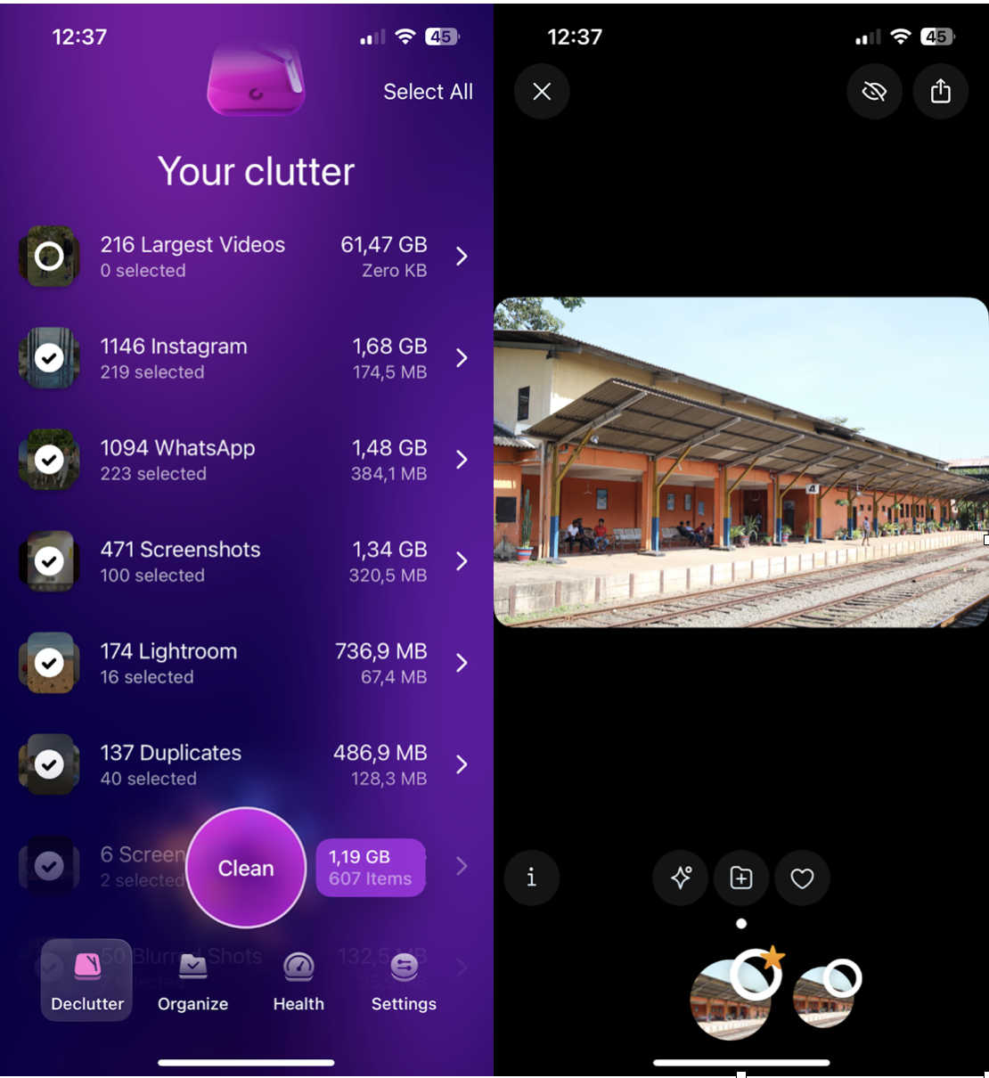 Käytä Declutter-moduulia osoitteestaCleanMy®Phonepoistaaksesi tonnia ei-toivottua mediaa. Se skannaa valokuvasi ja ryhmittelee sotkua selkeisiin ryhmiin, kuten kaksoiskappaleisiin, vastaaviin, kuvakaappauksiin, näyttötallenteisiin, sumeisiin, suuriin videoihin ja sovelluskansioihin. Sovelluskansiot tuovat esiin mediaa, jonka sovellukset ovat tallentaneet kirjastoosi, kuten WhatsApp ja Instagram, jotta voit tarkastella ja poistaa ne yhdessä paikassa. Näin: