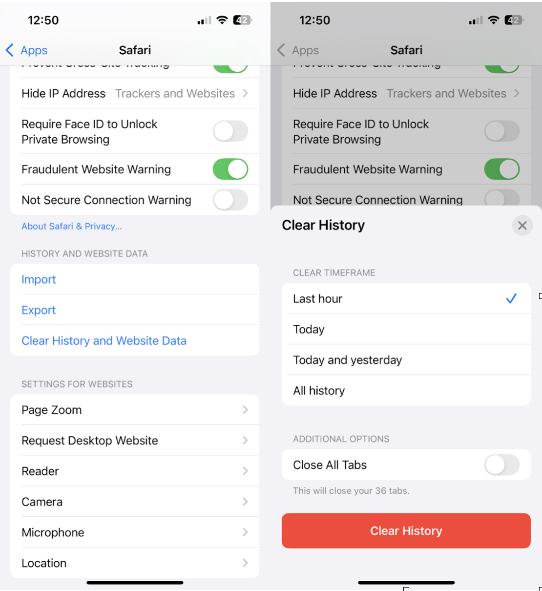 Vieritä alas ja etsi Tyhjennä historia ja verkkosivustotiedot.