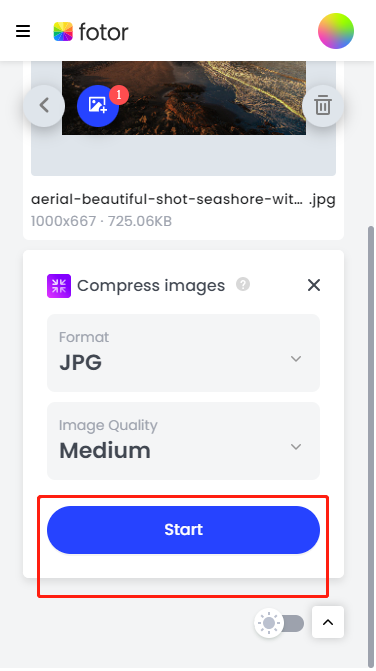 4. Napsauta “Käynnistä” -painiketta. Sitten Fotor pakata kuvat automaattisesti ja välittömästi pienemmälle tiedostokokolle korkealla laadulla.