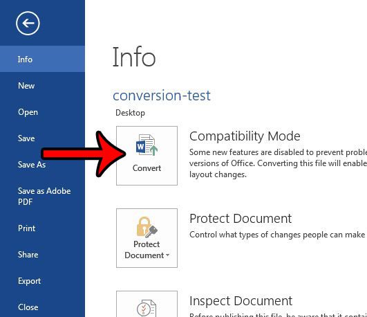Asiakirjan ei kuitenkaan tarvitse pysyä kyseisessä tiedostomuodossa, ja alla oleva opas näyttää sinulle muutaman vaiheen, jotka voit suorittaa asiakirjan muuntamiseksi, jotta se voi käyttää Word 2013: n täydellisiä ominaisuuksia.