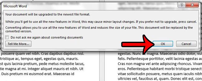 Vaihe 4: NapsautaHyväPainike muuntaaksesi asiakirjan Word 2013 -muotoon ja saada se pois yhteensopivuustilasta.