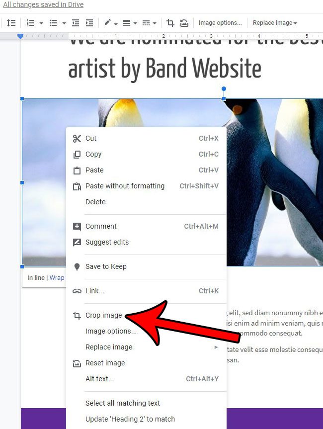 Alkuperäisen paikkamerkkikuvan koosta ja sen korvaamiseksi valitsemasi kuvan koosta riippuen saatat joutua muuttamaan kuvan rajausta. Voit tehdä tämän napsauttamalla kuvaa hiiren kakkospainikkeella ja valitsemalla sittenRajaa kuva.