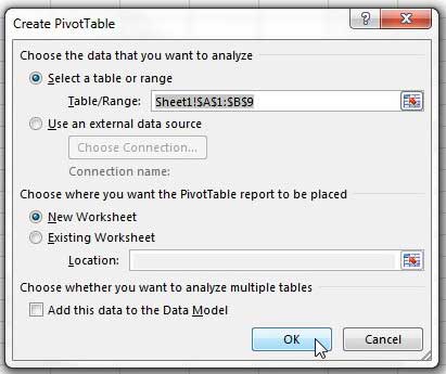 Napsauta Lisää ja sitten PivotTableVaihe 4: Aion jättää nämä asetukset niiden oletusarvoihin, jotka luovat uuden laskentataulukon kääntötauleelle. NapsauttaaHyväpainike jatkaaksesi.