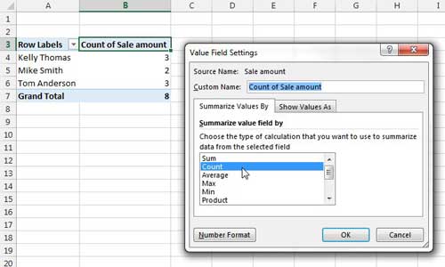Esimerkiksi, jos halusin tarkastella myynnin määrän kokonaismyynnin sijaan, voisin muuttaa optiota allaYhteenveto arvokenttään mennessä-llaLaskeasijastaSumma.