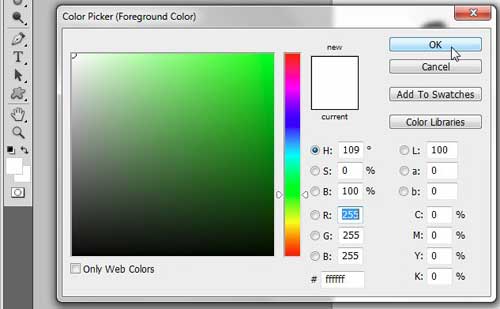 Vaihe 4: NapsautaEtuala väriLaatikko ikkunan vasemmalla puolella olevassa työkalupakissa, napsauta Väri-poiminnan vasemmasta yläkulmasta valitaksesi värivalkoisen ja napsauta sittenHyväpainike.