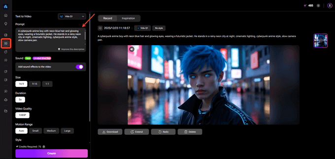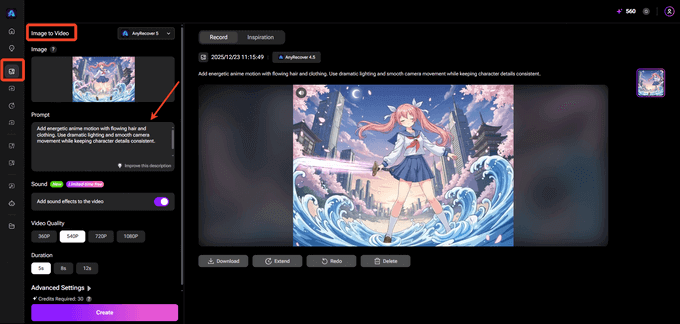 Kuvailet hahmon ulkonäköä, tyyliä, ympäristöä ja liikettä. Anycreate muuttaa kuvauksesi täysin animoiduksi animevideoksi.