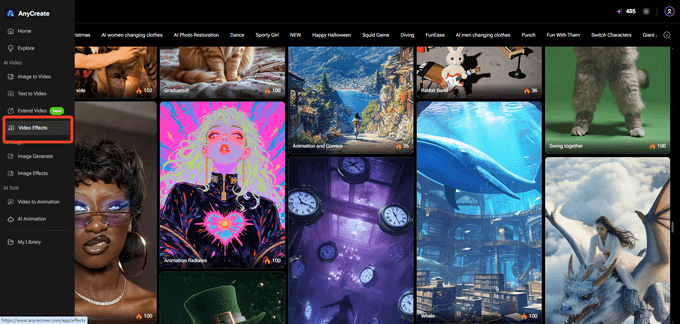 Nopeita ja tyylikkäitä tuloksia varten Anycreate tarjoaa kiinteänanime-videotehosteet.