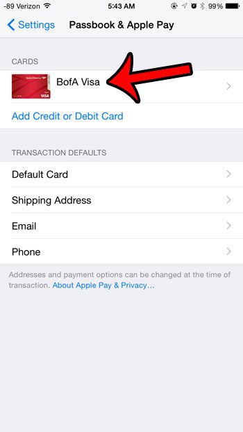 Tämän artikkelin vaiheet suoritettiin iPhone 6 Plus -sovelluksella iOS 8.4: ssä. Nämä samat vaiheet toimivat muiden iPhone -mallien kanssa, jotka ovat yhteensopivia Apple Pay: n kanssa, ja käyttävät iOS 8 tai korkeampia.
