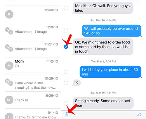 Vaihe 3: Kosketa ympyrää tekstiviestin vasemmalla puolella, jonka haluat poistaa. Huomaa, että voit valita useita viestejä. Kosketa roskakorin kuvaketta näytön alareunassa, kun olet valmis poistamaan viestejä.