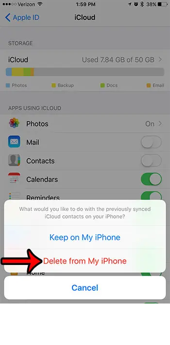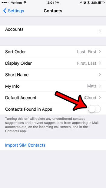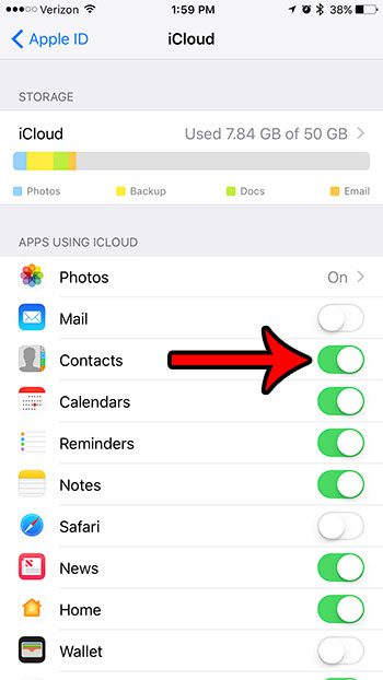 Mutta haluat mieluummin antaa toisen tilin hallita yhteystietojasi, ja iPloud -yhteystietojen sisällyttäminen iPhoneen saattaa aiheuttaa ongelman. Alla olevat vaiheet osoittavat, kuinka ne poistavat ne käytöstä.