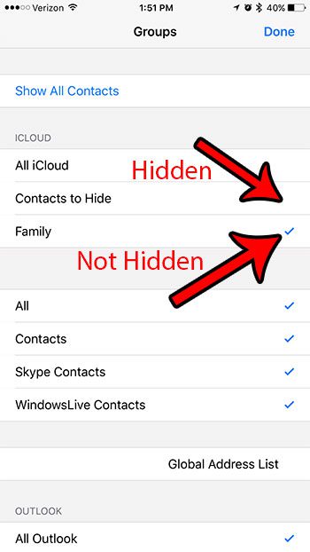 Vaihe 7: Poista valintamerkki luettelostasi piilottamista yhteystiedoista ja napauta sittenTehtyPainike näytön oikeassa yläkulmassa.