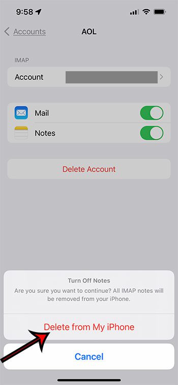 Kun painat Poista tiliä tämän prosessin aikana ja poistat tilin iPhonen postisovelluksesta, aiot myös poistaa muut liittyvät tiedot, kuten kalenterit tai muistiinpanot. Jos haluat poistaa sähköpostitilin, mutta ei kaikkea muuta tietoa, saatat mieluummin napauttaa painiketta postin oikealla puolella, jotta voit poistaa tämän ominaisuuden käytöstä sen sijaan, että napauta Poista tili ja poistaa kaikki.