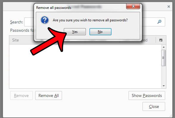 - NapsauttaaKylläPainike vahvistaaksesi, että haluat poistaa kaikki salasanat.