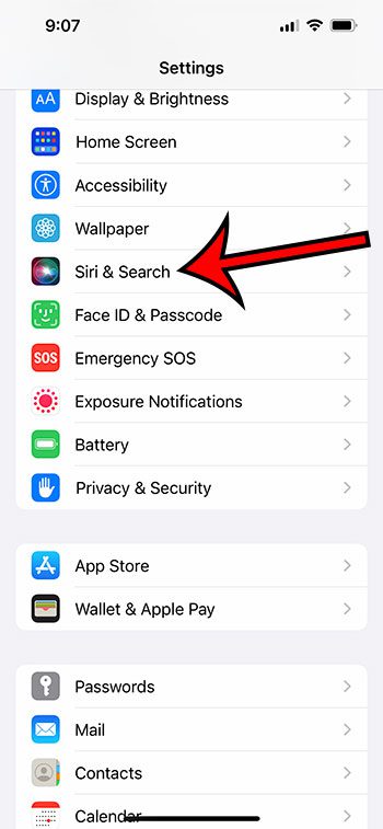 Vaihe 2: Vieritä alas ja valitseSiri ja hakuvaihtoehto valikosta.