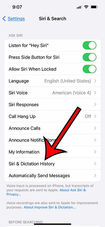 Vaihe 4; NapautaPoista Siri- ja saneluhistoriavaihtoehto näytön yläreunassa.
