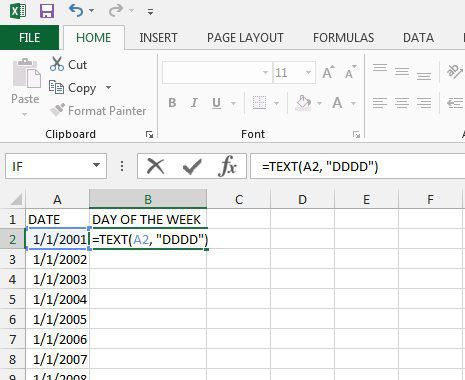 Vaihe 3: Kirjoita= Teksti (xx, “dddd”), mutta kirjoita solun sijainti, joka sisältää numeerisen päivämäärän sijastaXx. Alla olevassa kuvassa se olisiA2. Joten tuloksena oleva kaava olisi= Teksti (A2, “DDDD”). Voit sitten painaaKirjoittaanäppäimistöllä.