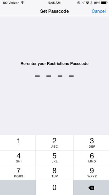 - Vaihe 5: Luo pääsykoodi, joka tarvitaan palaamaan tälle näytölle minkä tahansa asetusten säätämiseksi. Tämä passkoodi voi olla erilainen kuin laitteen lukituksen avaamiseen käytetty, mutta muista kirjoittaa tämä jonnekin, koska voi olla erittäin vaikeaa päästä rajoitusvalikkoon ilman passkoodia.