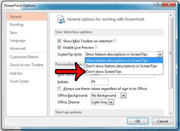 Vaihe 4: Napsauta avattava valikko oikealla puolellaSeulantyyppi, napsauta sittenÄlä näytä Screentipsiavaihtoehto. Voit sitten napsauttaaHyväPainikkeen sulkeminen ikkuna ja käytä muutoksia.