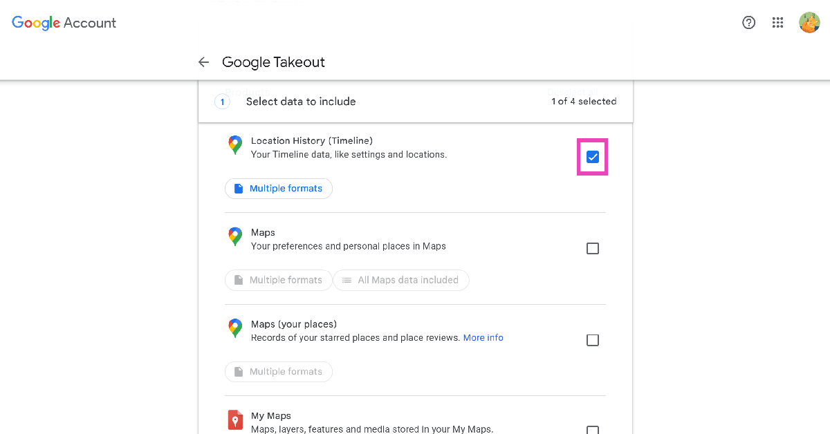 Vaihe 4:Sinut ohjataanGoogle Takeout. ValitaSijaintihistoria (aikajana).