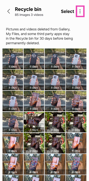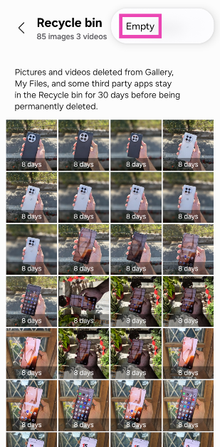 Samsung -käyttäjät voivat tyhjentää puhelimen kierrätysastiaan menemälläAsetukset> Laitehoito> Tallennus> Kierrä roskakori, valitsemalla tiedostoni/yhteystiedot/galleria, lyömällä ellipsejä näytön oikeassa yläkulmassa ja napauttamalla 'tyhjää'.