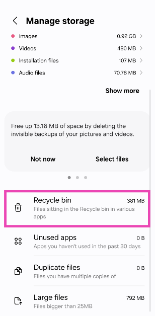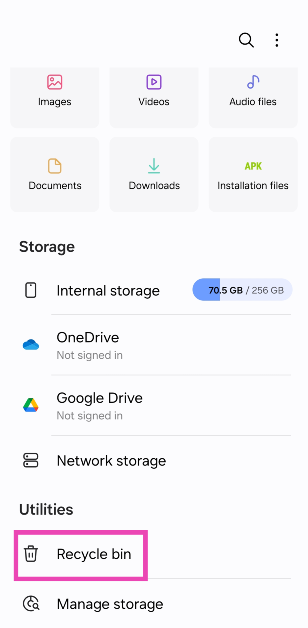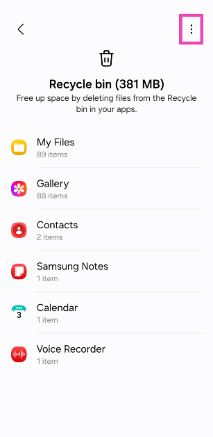 Alkuperäiset Samsung -sovellukset, kuten tiedostoni, galleria ja yhteystiedot, on erilliset kierrätysastiat. Voit käyttää heitä menemälläAsetukset> Laitehoito> Tallennus> Kierrä roskakori.